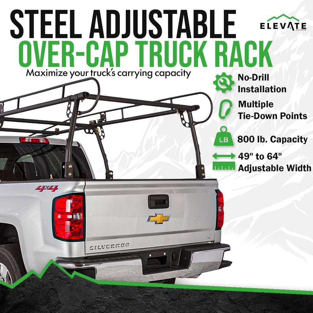 Carry larger cargo items and free up your pickup bed by installing the Elevate Outdoor Universal Over-Cab Truck Rack. With an 800 lb. weight capacity, this adjustable rack is manufactured from durable, powder-coated steel, and it can be installed on trucks with beds that measure 49" to 64" wide. By transporting cargo above your truck, ladders and similar large, unwieldy items will stay organized and can't damage the bed of your truck.