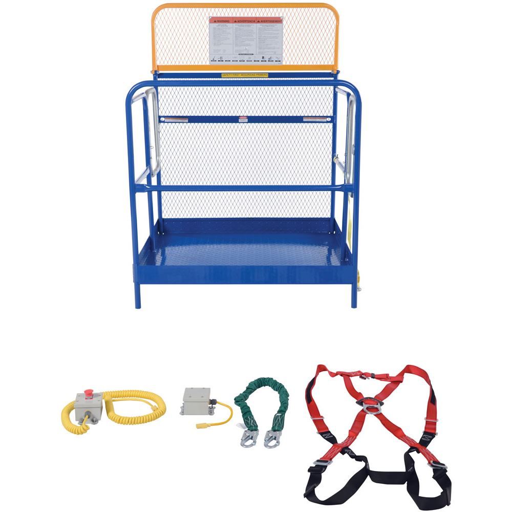 This Vestil Work Platform allows you to quickly and safely raise maintenance personnel using a forklift. Simply insert forklift forks into the Work Platform's fork pockets, secure the platform to the forklift, and you're ready to go! The tine lock must be engaged to secure platform to forks. The Vestil Work Platform features dual handrails on three sides, expanded metal backing on the fourth side, a checker floor plate platform, and a long strap with hook to attach the platform to forklift. The compact size allows you to maneuver into smaller spaces. A maximum of two people can be in the work platform at one time. This unit includes an emergency stop button kit and web lanyard with safety harness.