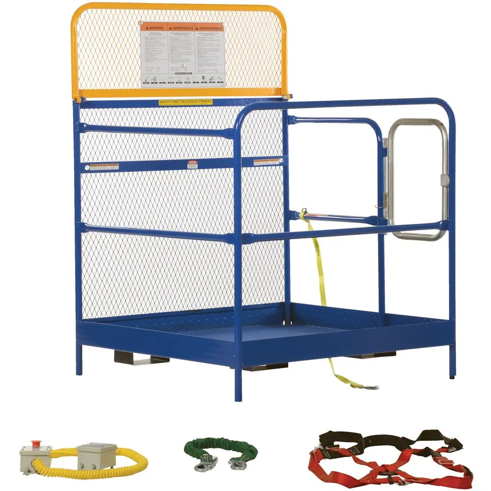 This Vestil Work Platform allows you to quickly and safely raise maintenance personnel using a forklift. Simply insert forklift forks into the Work Platform's fork pockets, secure the platform to the forklift, and you're ready to go! The tine lock must be engaged to secure platform to forks. The Vestil Work Platform features dual handrails on three sides, expanded metal backing on the fourth side, a checker floor plate platform, and a long strap with hook to attach the platform to forklift. The compact size allows you to maneuver into smaller spaces. A maximum of two people can be in the work platform at one time. This unit includes an emergency stop button kit and web lanyard with safety harness.