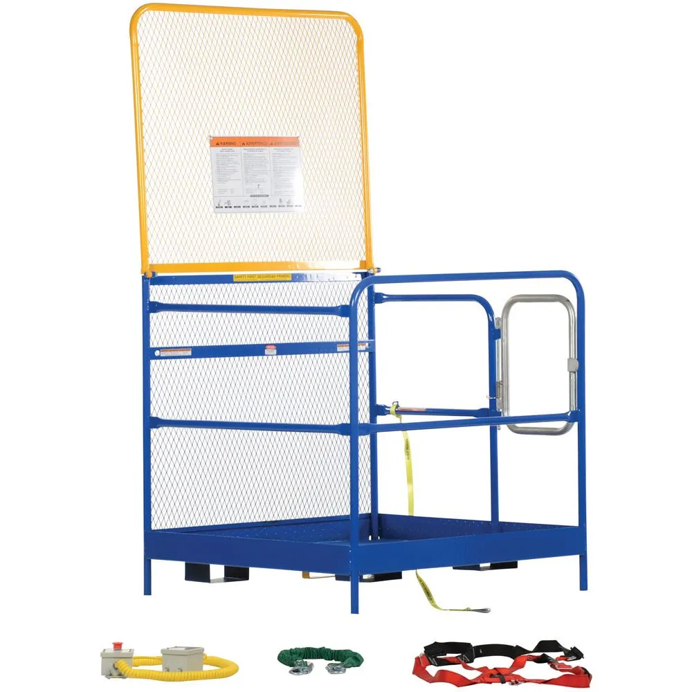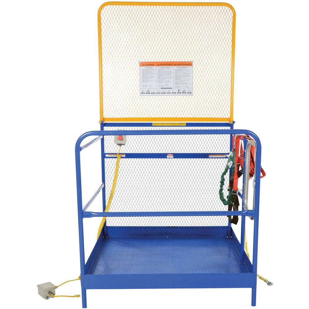 This Vestil Work Platform allows you to quickly and safely raise maintenance personnel using a forklift. Simply insert forklift forks into the Work Platform's fork pockets, secure the platform to the forklift, and you're ready to go! The tine lock must be engaged to secure platform to forks. The Vestil Work Platform features dual handrails on three sides, expanded metal backing on the fourth side, a checker floor plate platform, and a long strap with hook to attach the platform to forklift. The compact size allows you to maneuver into smaller spaces. A maximum of two people can be in the work platform at one time. Meets California OSHA specifications.