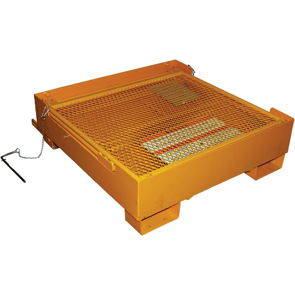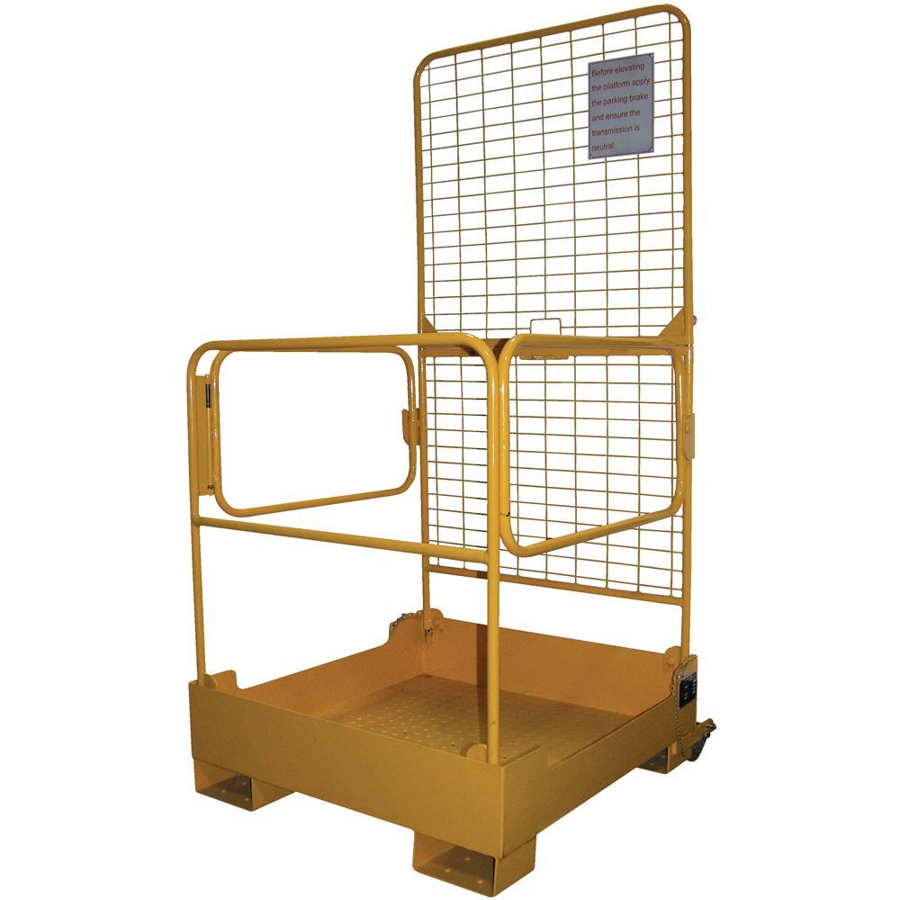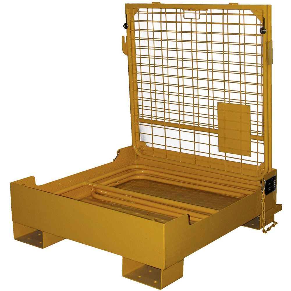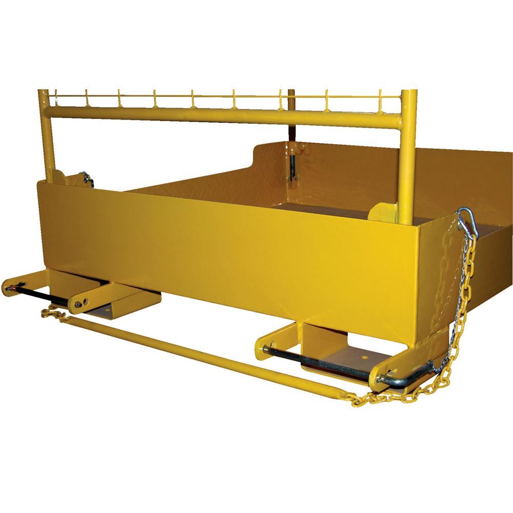 The Vestil Fold Down Work Platform elevates your personnel to overhead racks and shelving for safe and convenient access. When not in use, the work platform can be folded down and moved out of the way by just one person. This work platform stores conveniently in a bottom base, and features dual handrails on three sides, high expanded metal backing on the fourth side, checker floor plate platform, tine lock, and a safety restraint to attach it to forklift. Powder coat yellow finish. Steel construction.