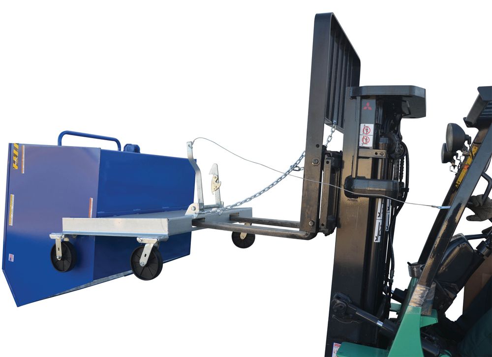 The Vestil Portable Steel Hopper makes handling waste and bulk material safer and more convenient. It features forklift entry tubes that are designed to move the hopper over rough terrain. Hopper tilts with assistance from operator. Features foot-operated caster lock and durable welded construction. The included safety restraint should be properly secured to a forklift before dumping.