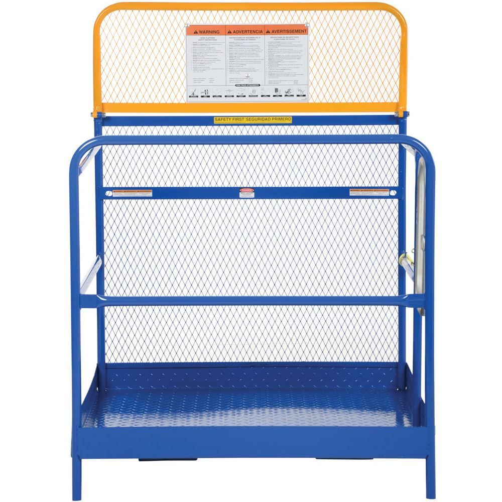 This Vestil Work Platform allows you to quickly and safely raise maintenance personnel using a forklift. Simply insert forklift forks into the Work Platform's fork pockets, secure the platform to the forklift, and you're ready to go! The tine lock must be engaged to secure platform to forks. The Vestil Work Platform features dual handrails on three sides, expanded metal backing on the fourth side, a checker floor plate platform, and a long strap with hook to attach the platform to forklift. The compact size allows you to maneuver into smaller spaces. A maximum of two people can be in the work platform at one time.