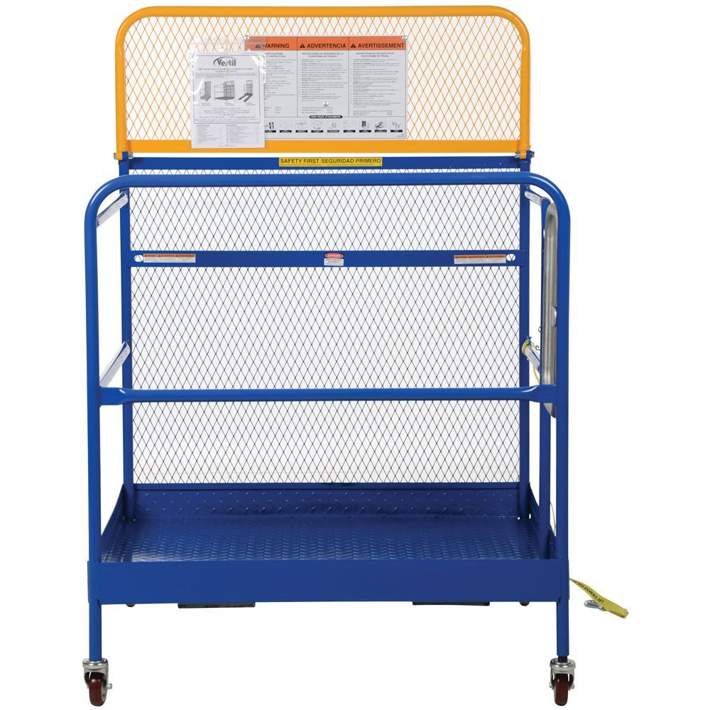 This Vestil Work Platform allows you to quickly and safely raise maintenance personnel using a forklift. Simply insert forklift forks into the Work Platform's fork pockets, secure the platform to the forklift, and you're ready to go! The tine lock must be engaged to secure platform to forks. The Vestil Work Platform features dual handrails on three sides, expanded metal backing on the fourth side, a checker floor plate platform, and a long strap with hook to attach the platform to forklift. The compact size allows you to maneuver into smaller spaces. A maximum of two people can be in the work platform at one time. Meets California OSHA specifications. This unit also includes casters for easy transportation.