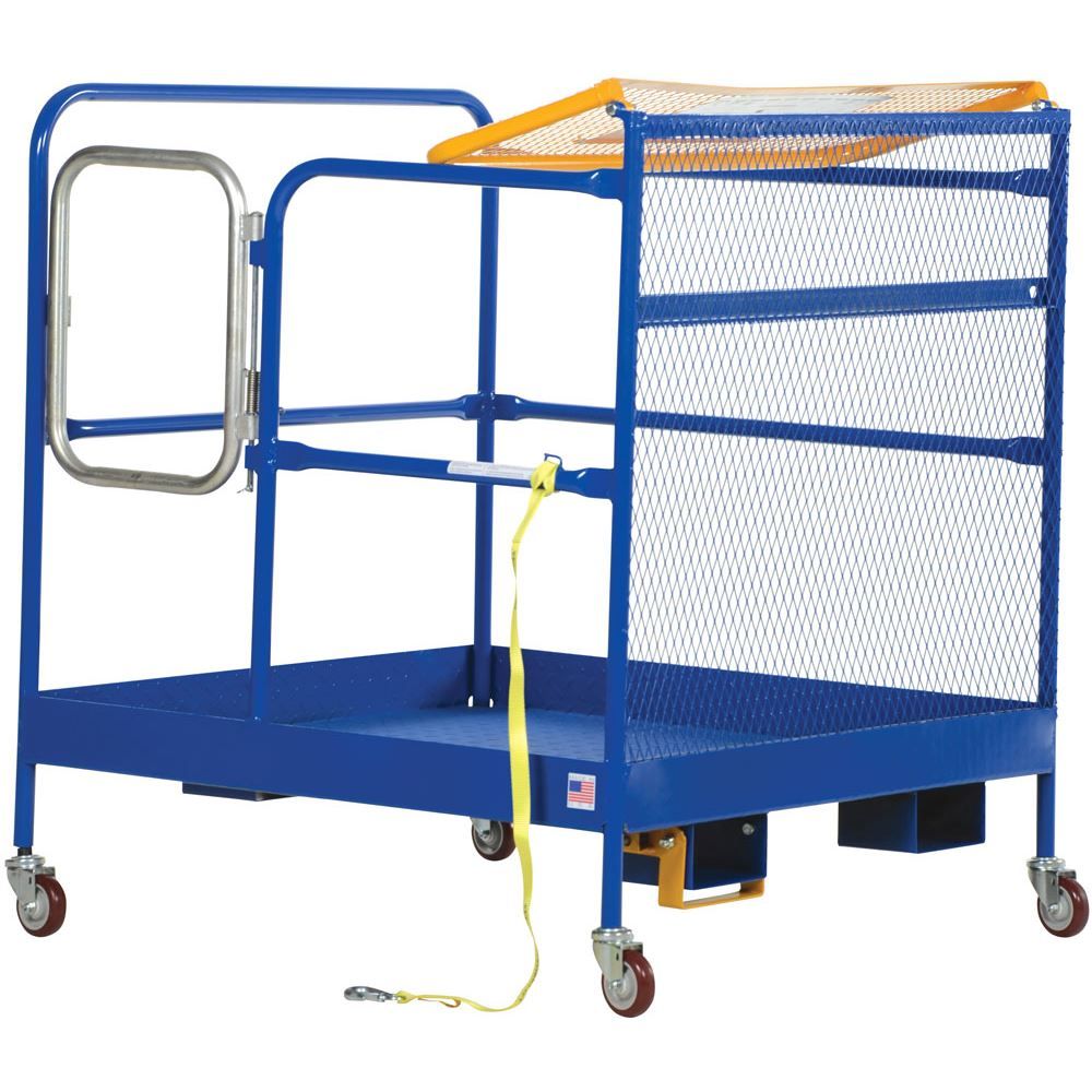 This Vestil Work Platform allows you to quickly and safely raise maintenance personnel using a forklift. Simply insert forklift forks into the Work Platform's fork pockets, secure the platform to the forklift, and you're ready to go! The tine lock must be engaged to secure platform to forks. The Vestil Work Platform features dual handrails on three sides, expanded metal backing on the fourth side, a checker floor plate platform, and a long strap with hook to attach the platform to forklift. The compact size allows you to maneuver into smaller spaces. A maximum of two people can be in the work platform at one time. This unit also includes casters for easy transportation.