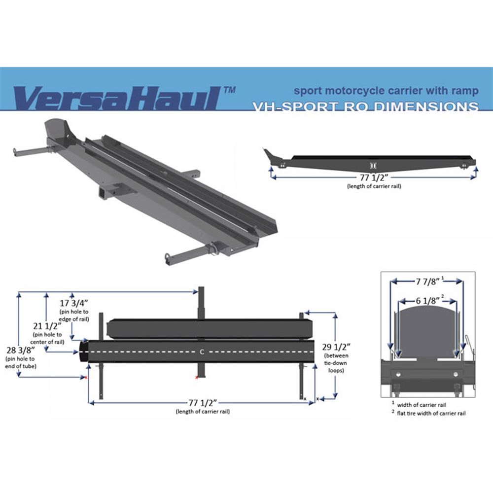 Transport your sport bike weighing up to 600 lbs from the rear of your vehicle without the cumbersome task of using a trailer with the VersaHaul sport motorcycle carrier. Mounting to a Class III or IV hitch receiver, this all steel powder coat finish carrier has a 600 lb. weight capacity and includes an anti-rattle device to keep your bike secure during transport, four retractable tie down bars, a wheel stop and two reflectors to increase visibility. This sport bike features a 77-1/2" long by 7-7/8'" wide track which can accommodate bikes with wheels up to over 7" wide.